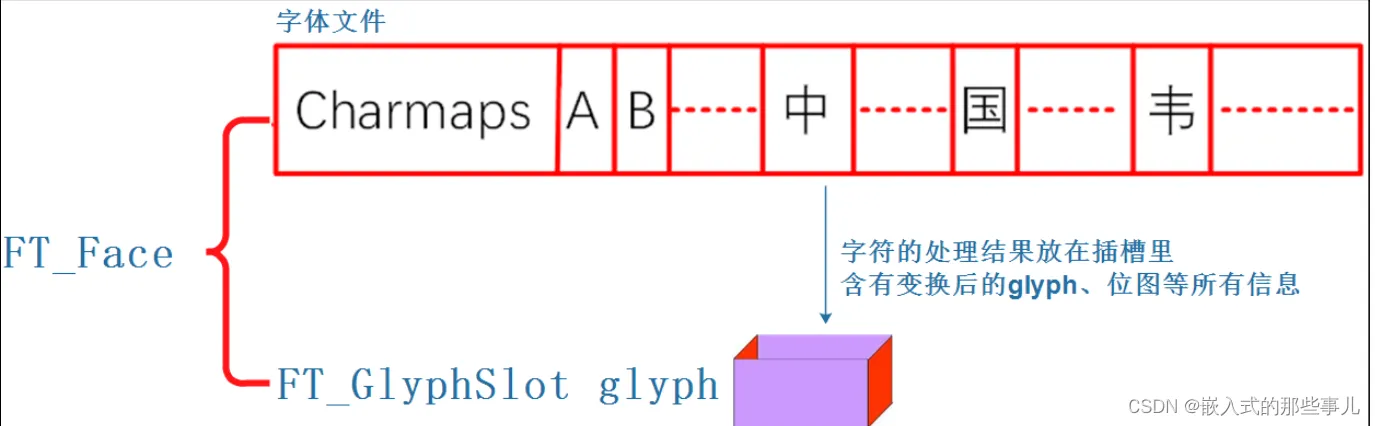 一个 face 中有很多字符,生成一个字符的点阵位图时,位图保存在哪里? 保存在插槽中:face->glyph。