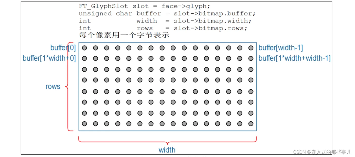 执 行 FT_Load_Char 之后,字符的位图被存在 slot->bitmap 里 , 即 face->glyph->bitmap