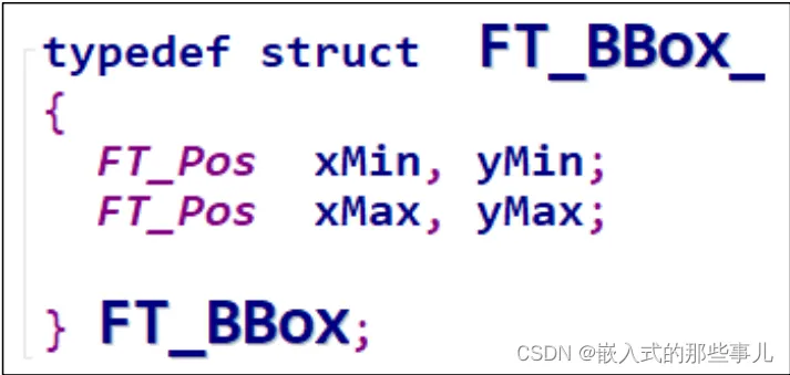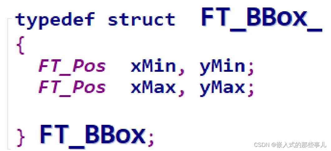 FT_BBox 结构体定义如下,它表示一个字符的外框,即新 glyph 的外框: