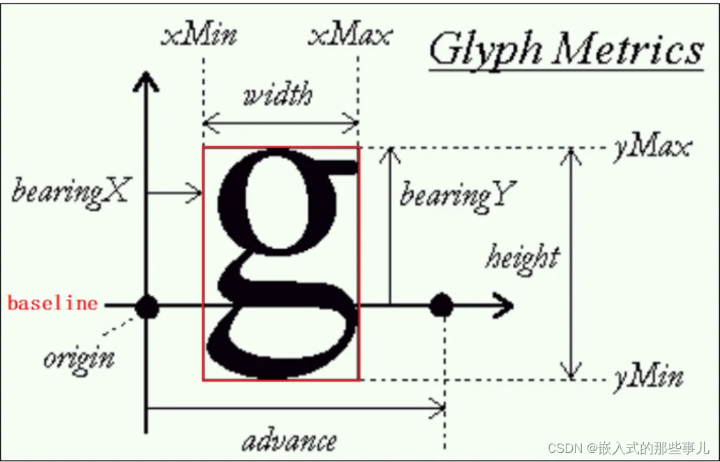 在 baseline 上,每一个字符都有它的原点(origin),比如上图中 baseline 左边的黑色圆点就是字母“g”的原点。当前 origin 加上 advance 就可以得到 下一个字符的 origin,比如上图中 baseline 右边的黑色圆点。在显示一行中多个文件字时,后一个文字的原点依赖于前一个文字的原点及 advance。
