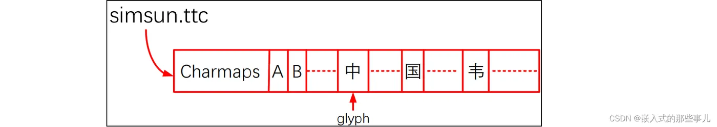 以 simsun.ttc 为例,该字体文件的格如下:头部含有 charmaps,可以使 用某种编码值去 charmaps 中找到它对应的关键点。下图中的“A、B、中、国、 韦”等只是 glyph 的示意图,表示关键点。
