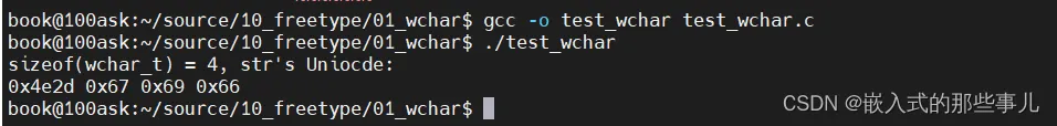 book@100ask:~/source/10_freetype/01_wchar$ gcc -o test_wchar test_wchar.c book@100ask:~/source/10_freetype/01_wchar$ ./test_wchar