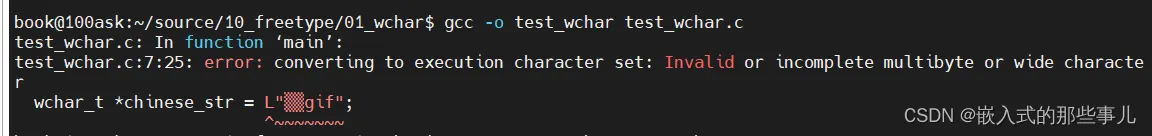book@100ask:~/source/10_freetype/01_wchar$ gcc -finput-charset=GB2312 -fexec-charset=UTF-8 -o test_wchar test_wchar.c