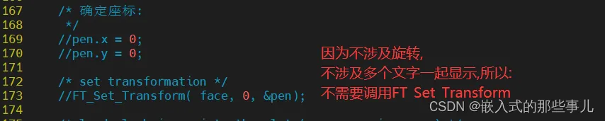 157 /* 显示矢量字体 */ 158 error = FT_Init_FreeType( &library ); /* initialize library */ 159 /* error handling omitted */ 160 161 error = FT_New_Face( library, argv[1], 0, &face ); /* create face object */ 162 /* error handling omitted */ 163 slot = face->glyph; 164 165 FT_Set_Pixel_Sizes(face, font_size, 0); 166 167 /* 确定座标: 168 */ 169 //pen.x = 0; 170 //pen.y = 0; 171 172 /* set transformation */ 173 //FT_Set_Transform( face, 0, &pen); 174 175 /* load glyph image into the slot (erase previous one) */ 176 error = FT_Load_Char( face, chinese_str[0], FT_LOAD_RENDER ); 177 if (error) 178 { 179 printf("FT_Load_Char error\n"); 180 return -1; 181 }