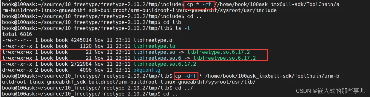 //把头文件放到工具交叉链中 book@100ask:~/source/10_freetype/freetype-2.10.2/tmp/include$ cp * -rf //home/book/100ask_imx6ull-sdk/ToolChain/a rm-buildroot-linux-gnueabihf_sdk-buildroot/arm-buildroot-linux-gnueabihf/sysroot/usr/include //把库文件放到工具交叉链中 book@100ask:~/source/10_freetype/freetype-2.10.2/tmp/lib$ cp -drf * /home/book/100ask_imx6ull-sdk/ToolChain/arm-b uildroot-linux-gnueabihf_sdk-buildroot/arm-buildroot-linux-gnueabihf/sysroot/usr/lib/