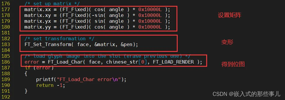 176 /* set up matrix */ 177 matrix.xx = (FT_Fixed)( cos( angle ) * 0x10000L ); 178 matrix.xy = (FT_Fixed)(-sin( angle ) * 0x10000L ); 179 matrix.yx = (FT_Fixed)( sin( angle ) * 0x10000L ); 180 matrix.yy = (FT_Fixed)( cos( angle ) * 0x10000L ); 181 182 /* set transformation */ 183 FT_Set_Transform( face, &matrix, &pen); 184 185 /* load glyph image into the slot (erase previous one) */ 186 error = FT_Load_Char( face, chinese_str[0], FT_LOAD_RENDER ); 187 if (error) 188 { 189 printf("FT_Load_Char error\n"); 190 return -1; 191 } 192
