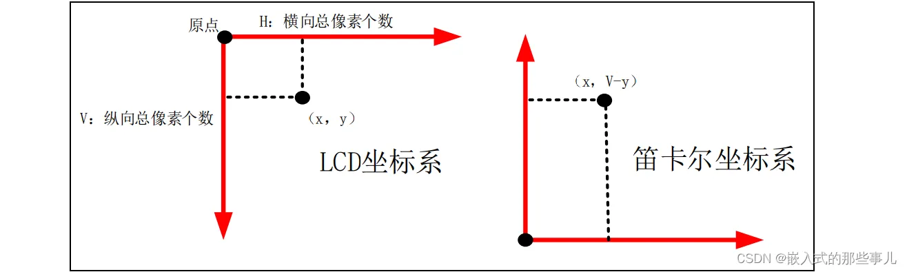 在 LCD 坐标系中坐标是(x, y),那么它在笛卡尔坐标系中的坐标值为(x, V-y)。 反过来也是一样的,在笛卡尔坐标系中坐标是(x, y),那么它在 LCD 坐标 系中坐标值为(x, V-y)。