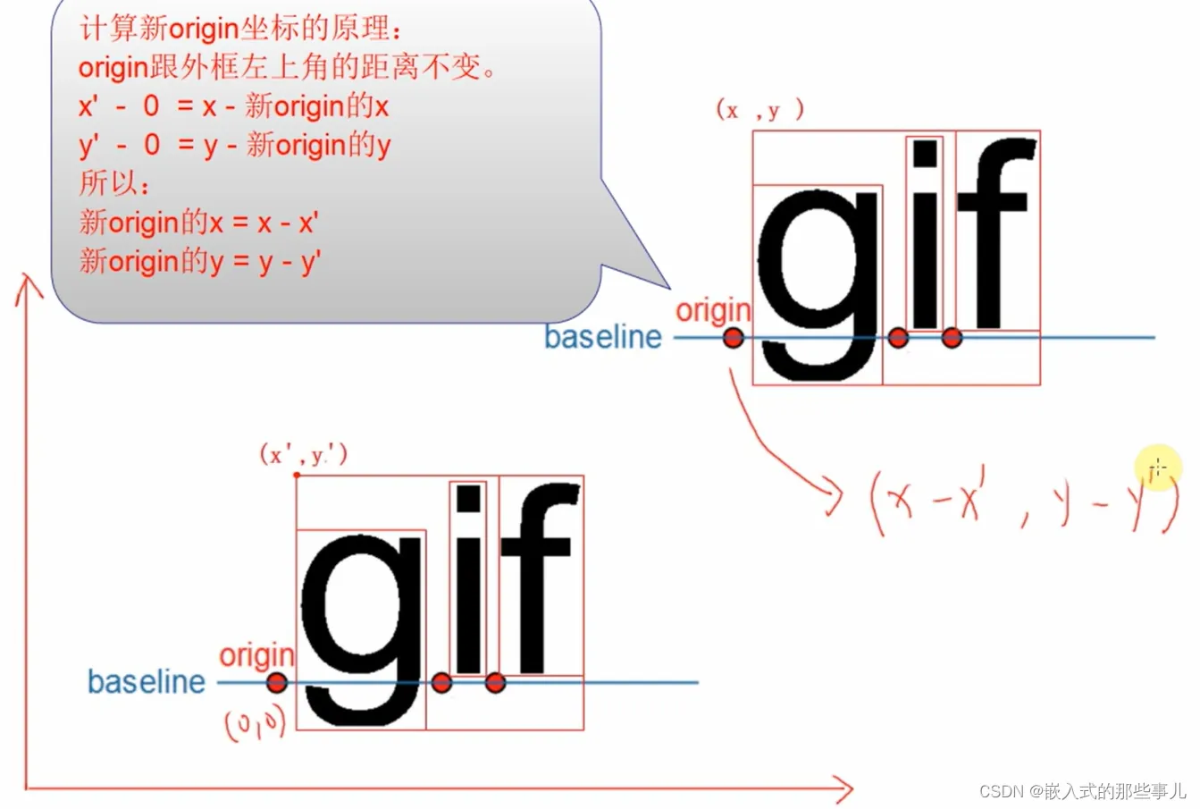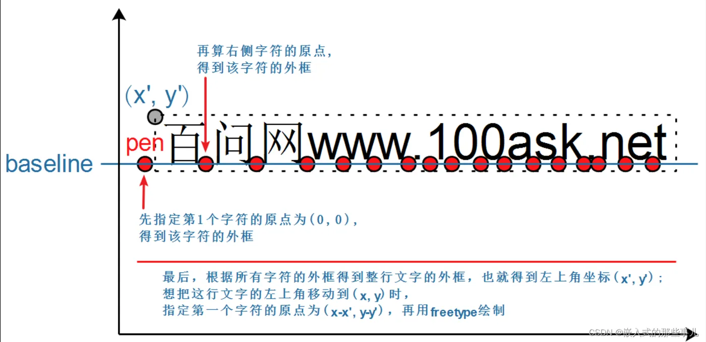 (3)想在(x, y)处显示这行文字,调整一下 pen 坐标即可,pen 为(0, 0)时对应左上角(x', y');那么左上角为(x, y)时就可以算出 pen 为(x-x', y-y')。