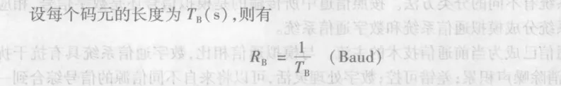 式中,RB为码元传输速率,简称传码率。它被定义为单位时间(每秒)传输码元的数目,单位为波特( Baud) ,因此,又称RB为波特率。