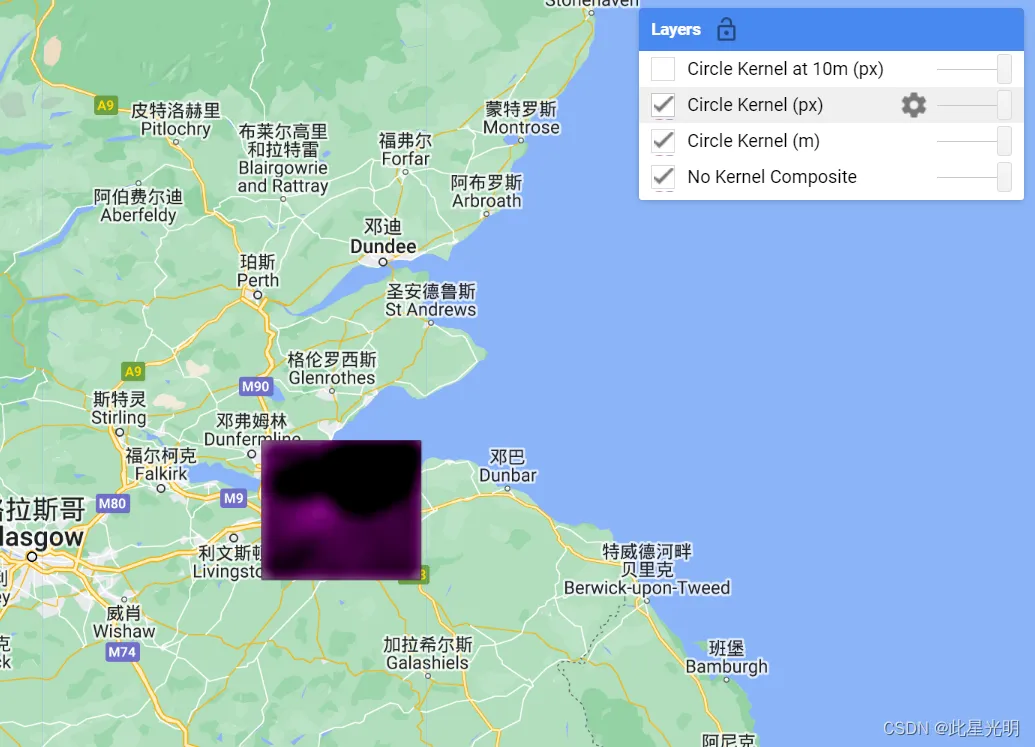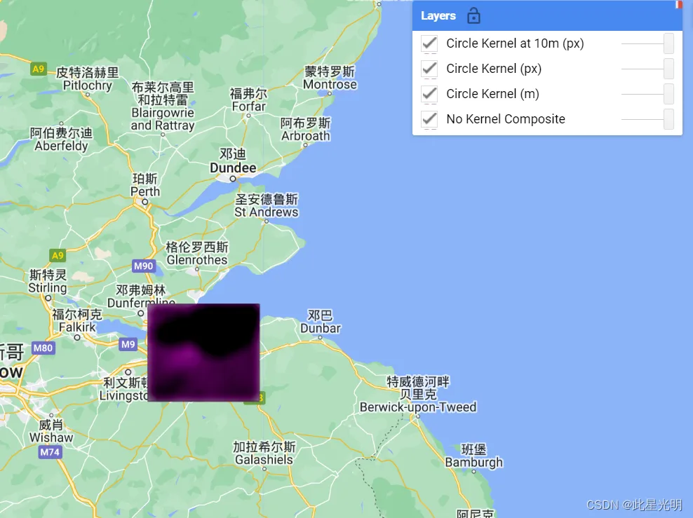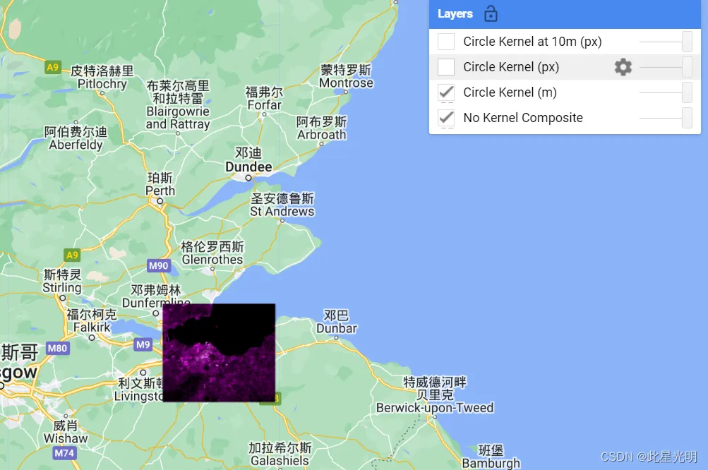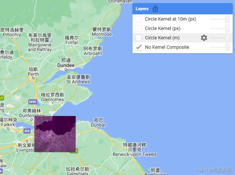 //研究区和数据集 var imageCollection = ee.ImageCollection("COPERNICUS/S1_GRD"), geometry = /* color: #98ff00 */ /* shown: false */ /* displayProperties: [ { "type": "rectangle" } ] */ ee.Geometry.Polygon( [[[-3.4157601749762367, 56.09914841569624], [-3.4157601749762367, 55.81469755998435], [-2.8334847843512367, 55.81469755998435], [-2.8334847843512367, 56.09914841569624]]], null, false), geometry2 = /* color: #0b4a8b */ /* shown: false */ /* displayProperties: [ { "type": "rectangle" } ] */ ee.Geometry.Polygon( [[[-3.414419891474414, 56.01742307470684], [-3.414419891474414, 55.98877181348714], [-3.3768260499216796, 55.98877181348714], [-3.3768260499216796, 56.01742307470684]]], null, false); //数据过滤和筛选 var filtered = imageCollection .filterBounds(geometry) .filterDate("2023-01-01", "2023-01-31") //影像镶嵌和裁剪 var img = filtered .mean() .select([0, 1]) .clip(geometry) //选择坐标系 var proj = filtered.first().select(0).projection() //建立核函数 var circle_metres = ee.Kernel.circle({ radius: 100, units: "meters", magnitude: 2 }) // gsd 是 ~10 米,因此将其调整为 10 像素,以便与上述原生比例相当 var circle_pixels = ee.Kernel.circle({ radius: 10, units: "pixels", magnitude: 2 }) var circle_pixels_projected = ee.Kernel.circle({ radius: 10, units: "pixels", magnitude: 2 }) //按照核函数进行卷积 var img_m = img.convolve(circle_metres) var img_p = img.convolve(circle_pixels) var img_forced_res = img.convolve(circle_pixels_projected).reproject(proj.atScale(1)) var vis = { "min": -26, "max": 10, "bands": ["VV", "VH", "VV"] } Map.centerObject(geometry2) Map.addLayer(img, vis, "No Kernel Composite") Map.addLayer(img_m, vis, "Circle Kernel (m)") Map.addLayer(img_p, vis, "Circle Kernel (px)") Map.addLayer(img_forced_res, vis, "Circle Kernel at 10m (px)")