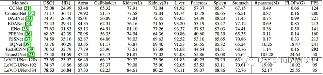 LeViT模型优于现有模型,并且明显快于TransUNet,后者将Transformer块合并到CNN中。