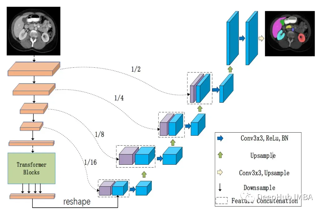 在编码器的最后阶段将来自卷积块和变压器块的特征连接起来。这使得编码器具有本地和全局特性。局部特征对于识别图像中的小而详细的物体很重要,而全局特征对于识别图像的整体结构很重要。通过结合局部和全局特征,编码器能够生成更准确的分割。