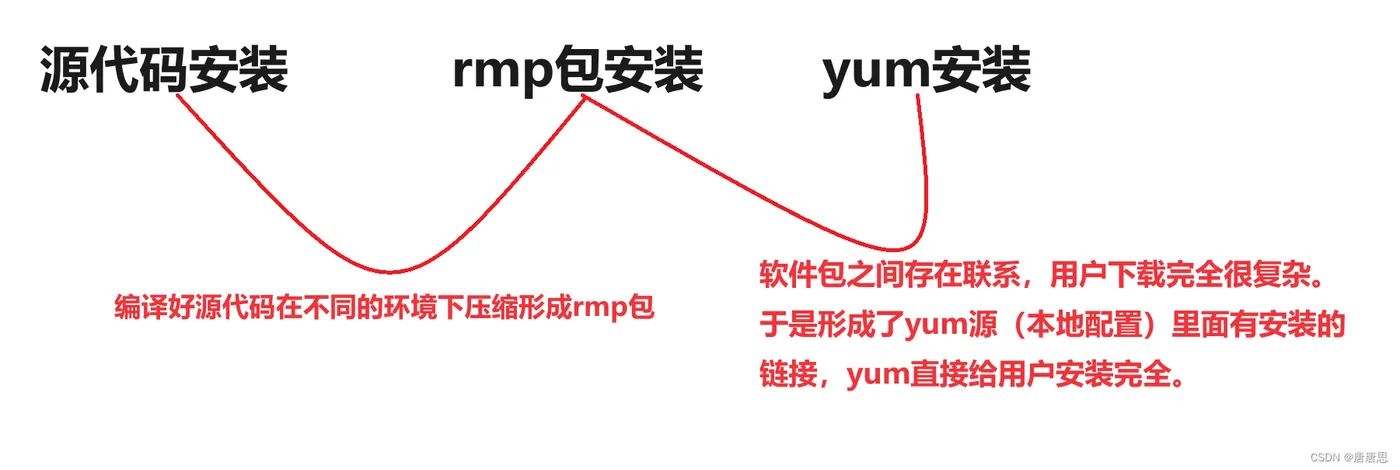 - 但是这样太麻烦了, 于是有些人把一些常用的软件提前编译好, 做成软件包(可以理解成windows上的安装程序)放在一个服务器上, 通过包管理器可以很方便的获取到这个编译好的软件包, 直接进行安装。