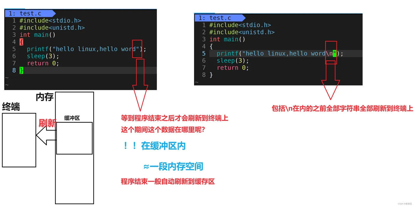 结论:包括\n在内的之前全部字符串全部刷新到我们的显示器上(行刷新)