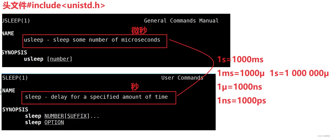 - 头文件#include<unistd.h> //sleep所需要的头文件包含【Linux系统编程】Linux的系统库中的unistd.h头文件的作用-CSDN博客
