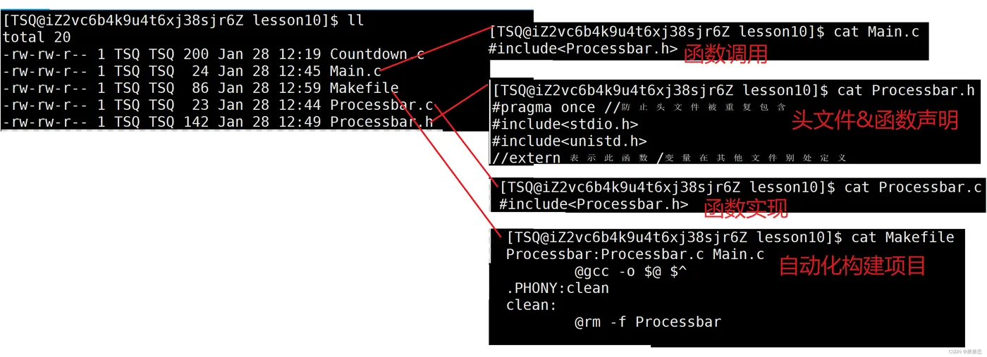- Makefile里面不需要包含头文件Processbar.h,因为头文件在当前目录下且Processbar.c和Main.c都包含了Processbar.h在自动化构建编译时,回展开头文件,所以不需要!!