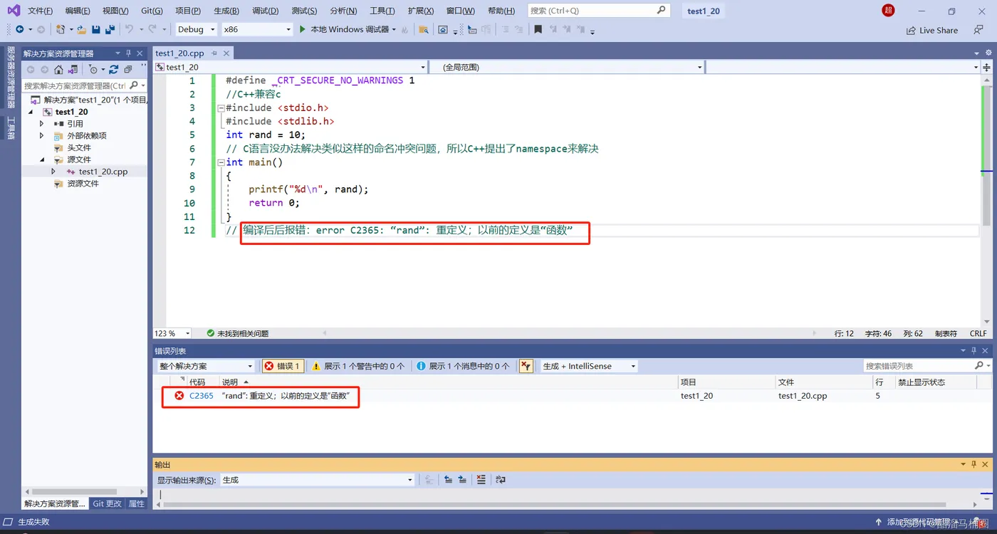 #include <stdio.h> #include <stdlib.h> int rand = 10; // C语言没办法解决类似这样的命名冲突问题,所以C++提出了namespace来解决 int main() { printf("%d\n", rand); return 0; } // 编译后后报错:error C2365: “rand”: 重定义;以前的定义是“函数”