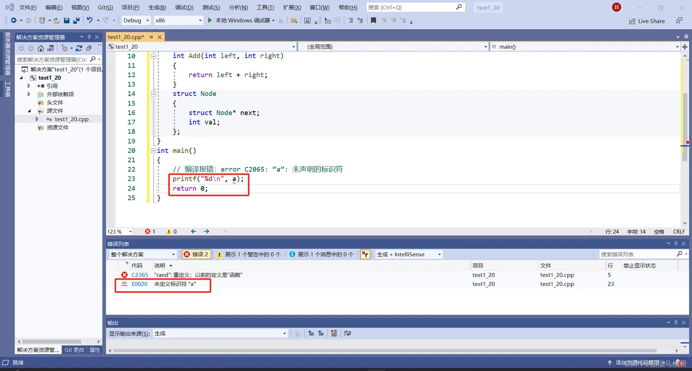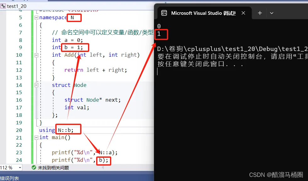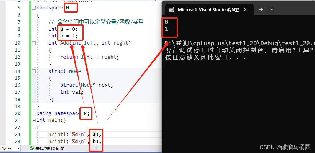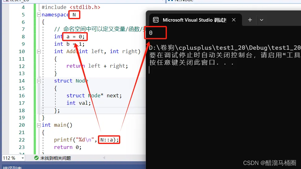 namespace N { // 命名空间中可以定义变量/函数/类型 int a = 0; int b = 1; int Add(int left, int right) { return left + right; } struct Node { struct Node* next; int val; }; } int main() { // 编译报错:error C2065: “a”: 未声明的标识符 printf("%d\n", a); return 0; }