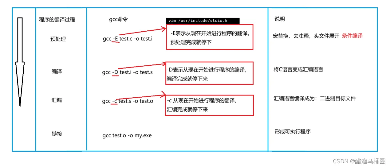 程序的翻译过程分为:预处理、编译、汇编、链接