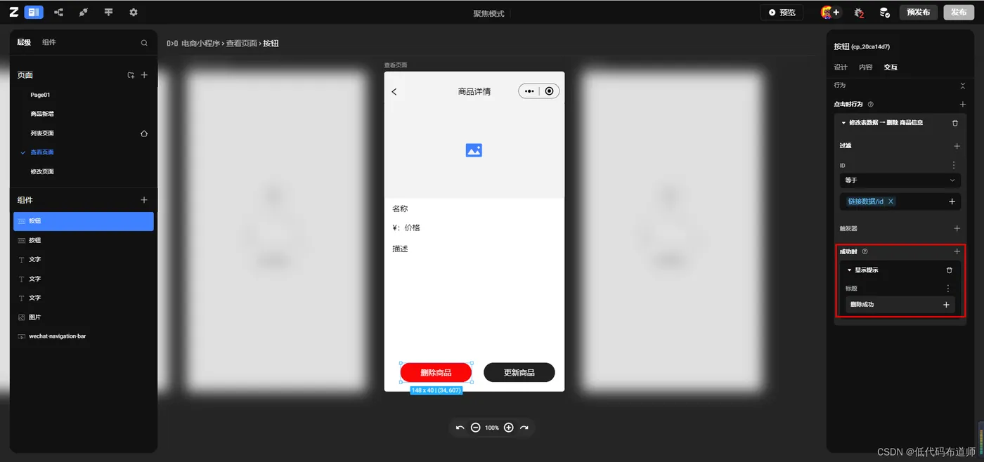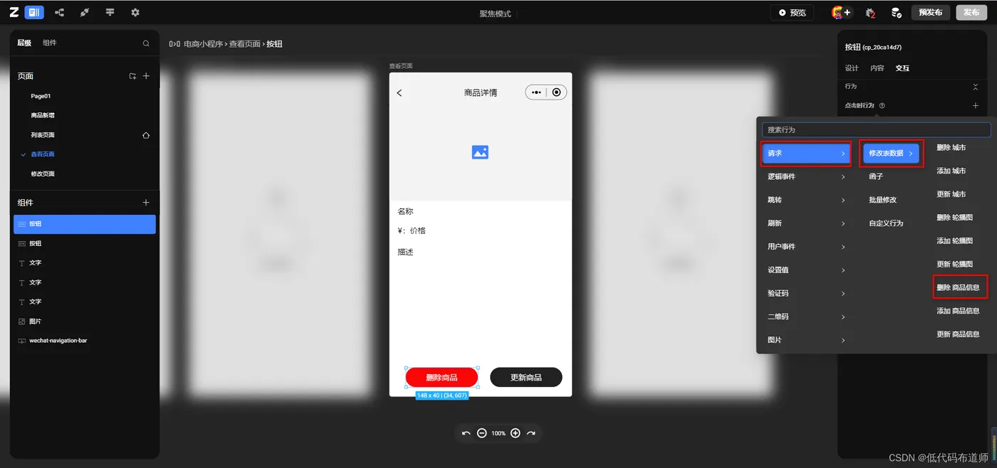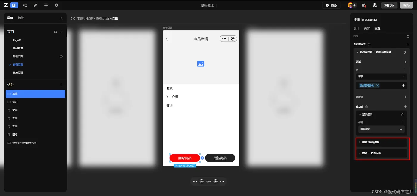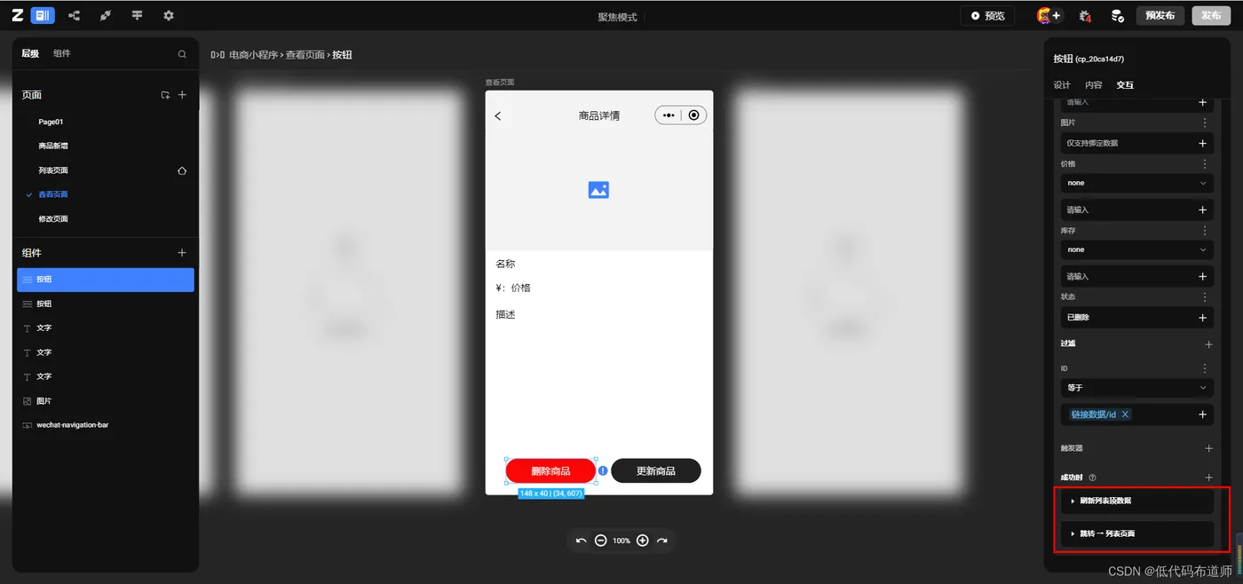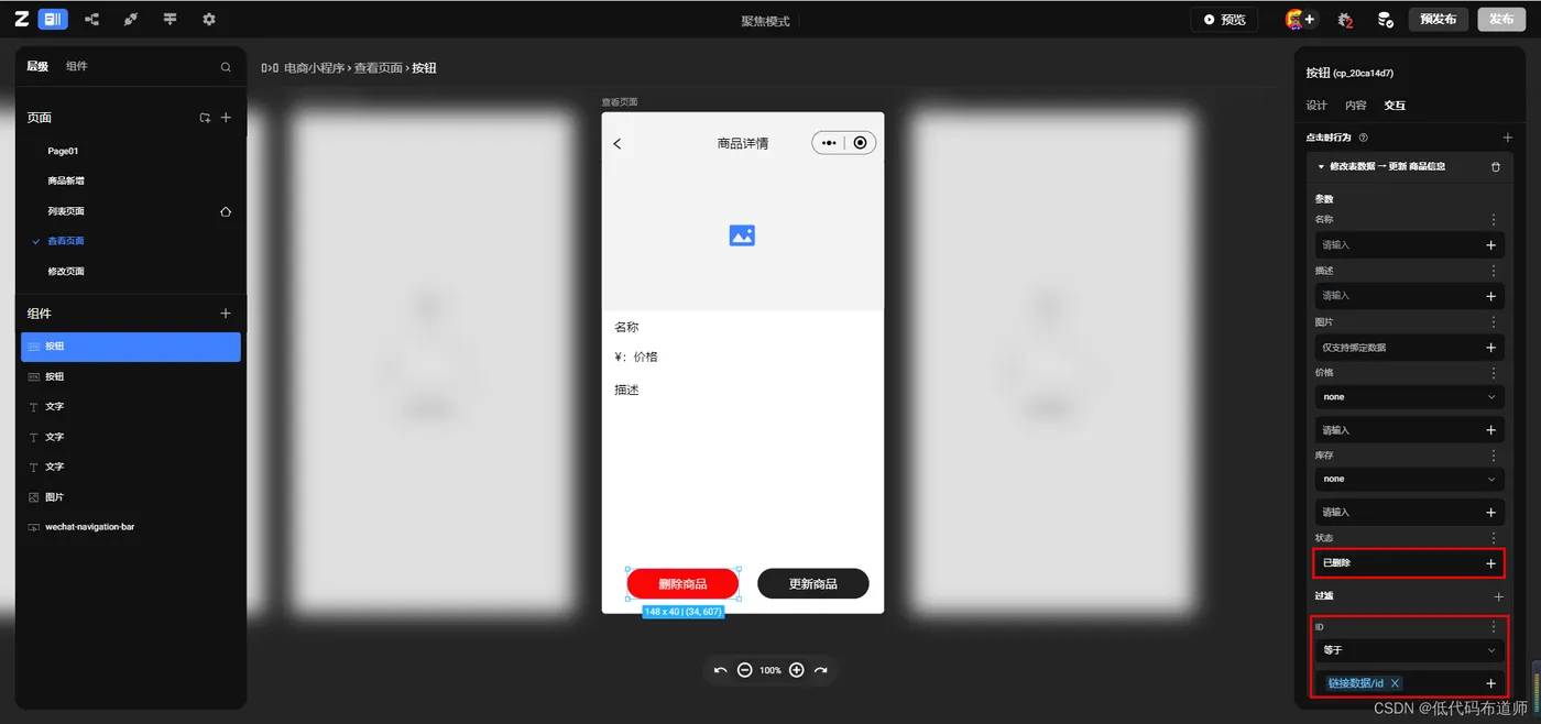 然后回到我们的详情页,这个时候按钮的点击行为我们要配置成更新商品,更新的字段为状态,删除的时候我们就更新为已删除