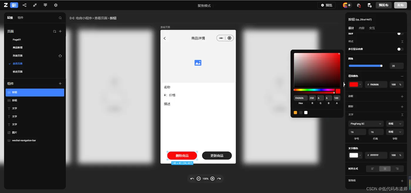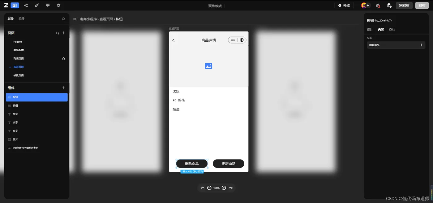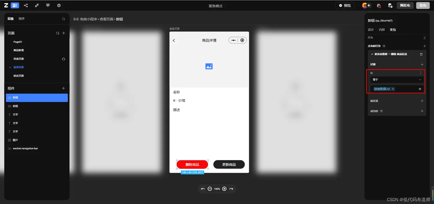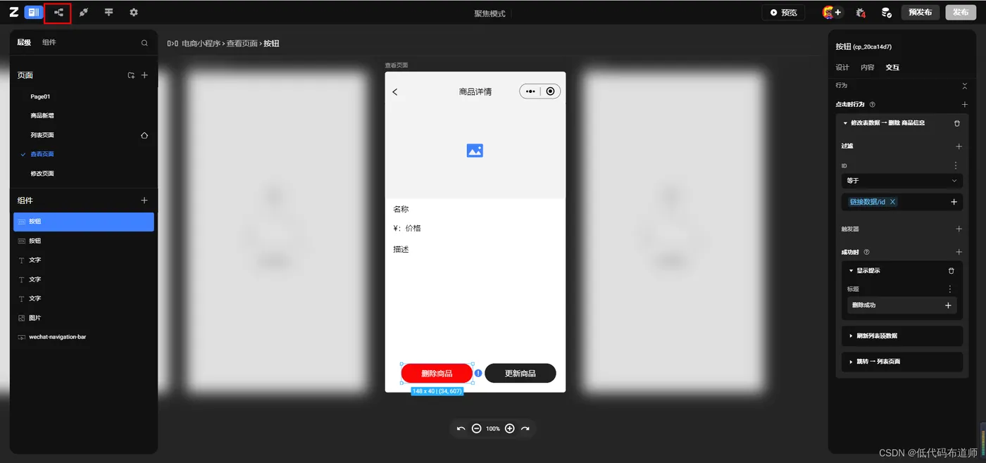 打开我们的详情页,配置一个按钮,修改一下内容改为删除商品