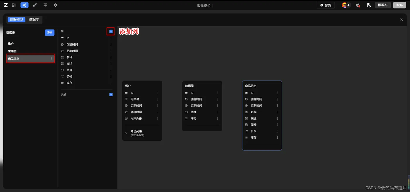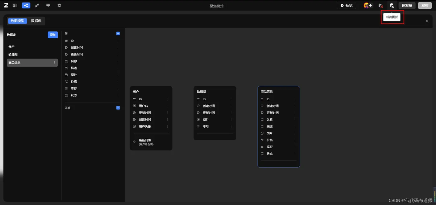 我们上边是讲解的真删除数据,接着讲解一下假删除数据。假删除的话首先需要修改一下我们的数据表,点击顶部导航条的数据模型菜单