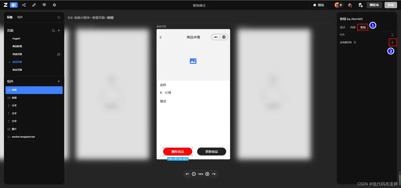然后给按钮配置行为,切换到交互页签,设置点击时的行为
