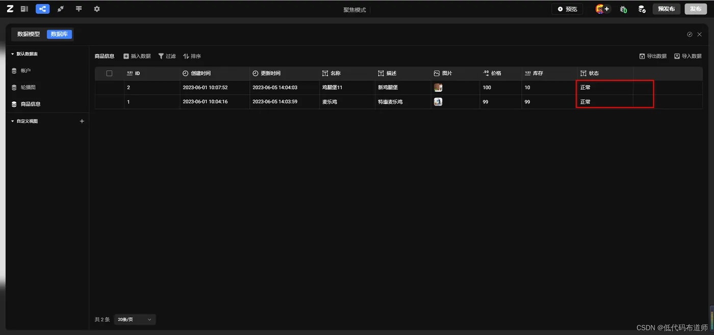 状态的话我们用文本来区别,切换到数据库,我们把状态这一列都修改为正常