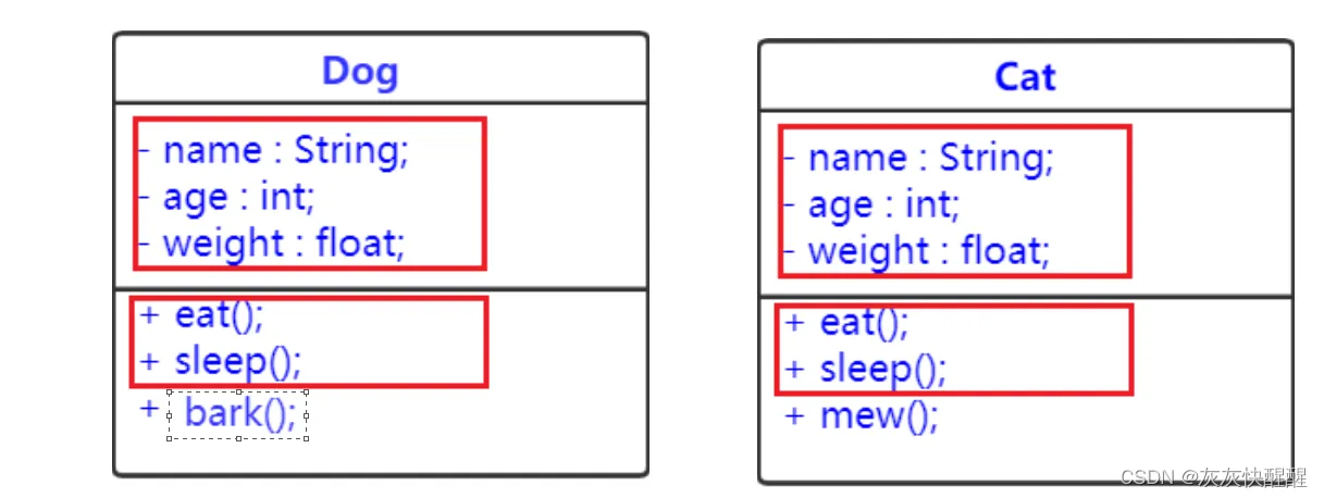 //创建一个狗类 public class Dog { String name; int age; float weight; public void eat(){ System.out.println(name + "正在吃饭"); } public void sleep(){ System.out.println(name + "正在睡觉"); } void bark(){ System.out.println(name + "汪汪汪"); } } //创建一个猫类 public class Cat { String name; int age; float weight; public void eat(){ System.out.println(name + "正在吃饭"); } public void sleep(){ System.out.println(name + "正在睡觉"); } void mew(){ System.out.println(name + "喵喵喵~~~"); } }