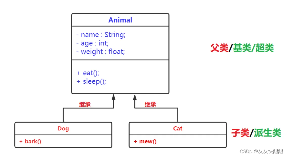 上述图示中,Dog和Cat都继承了Animal类,其中:Animal类称为父类/基类/超类,Dog和Cat可以称为Animal的子类/派生类,继承之后,子类可以复用父类中的成员,子类在实现时只需关心自己新增加的成员即可。