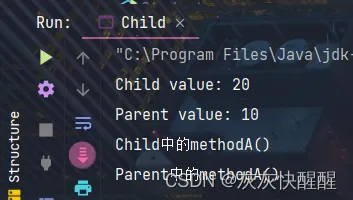 class Parent { int value = 10; public void methodA() { System.out.println("Parent中的methodA()"); } } class Child extends Parent { int value = 20; public void methodA() { System.out.println("Child中的methodA()"); } void printValues() { System.out.println("Child value: " + value); // 子类字段 System.out.println("Parent value: " + super.value); // 父类字段 methodA();//子类方法 super.methodA();//父类方法 } public static void main(String[] args) { Child c = new Child(); c.printValues(); } }