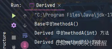 class Base { public void methodA() { System.out.println("Base中的methodA()"); } public void methodB() { System.out.println("Base中的methodB()"); } } public class Derived extends Base { public void methodA(int a) { System.out.println("Derived 中的methodA(int) 方法"); } public void methodB() { System.out.println("Derived 中的methodB() 方法"); } public void methodC() { methodA();//没有传参,访问父类中的methodA() methodA(20);//有传参,访问子类中的methodA(int) methodB();//直接访问,则永远访问到的都是子类中的methodB(),永远无法访问到基类的 } public static void main(String[] args) { Derived d = new Derived(); d.methodC(); } }