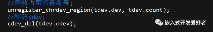 注销设备时候,使用unregister_chrdev_region(dev_t, unsigned);第一个参数设备号,和注册时候的要一致,因此如果是动态分配的就需要保存起来,第二个参数是次设备的个数。