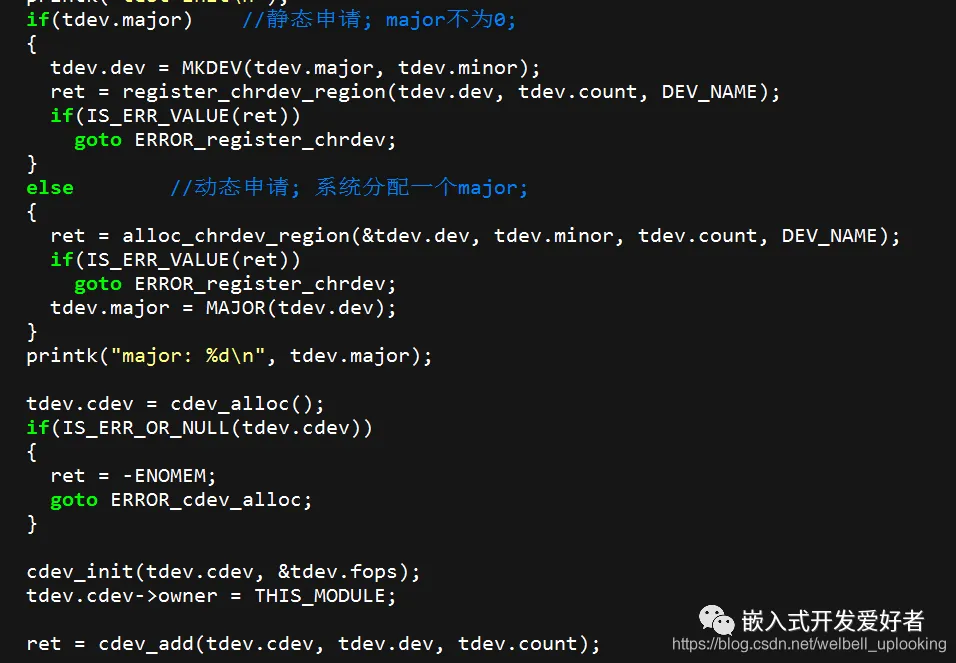 如果是动态申请的设备号,就用cdev_add(&devno, MKDEV(mem_major, 0), count);