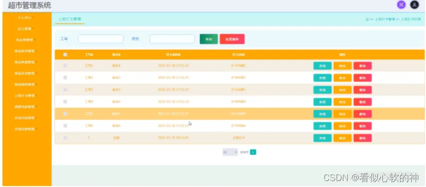 上班打卡管理,在上班打卡管理页面中可以查看工号、姓名、打卡时间、打卡内容等信息,并且根据需要对已有上班打卡管理进行查看删除等其他详细操作。