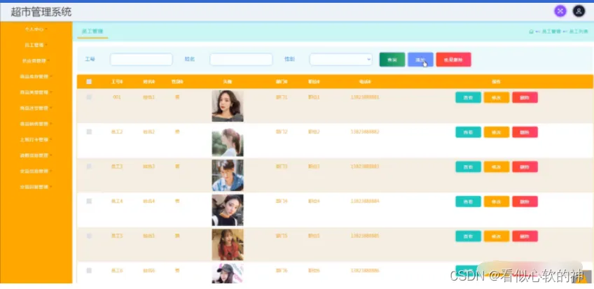 员工管理,在员工管理页面中可以通过填写工号、姓名、性别、头像、部门、职位、电话等内容进行修改、删除,还可以根据需要对商品类型管理进行详情,修改等详细操作