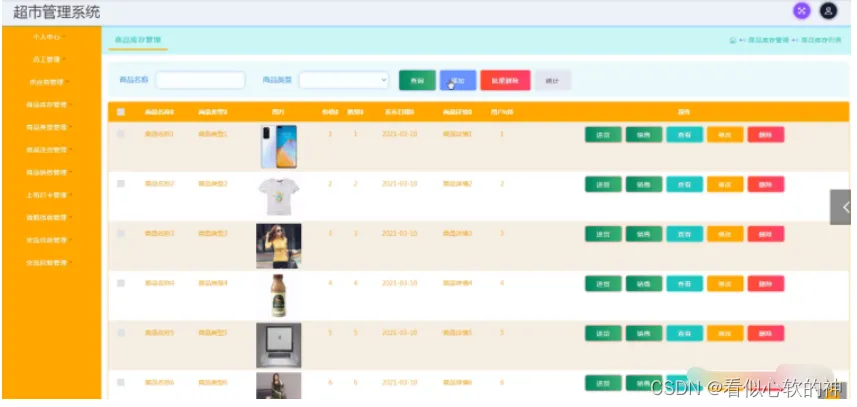 商品库存管理,在商品库存管理页面中可以查看商品名称、商品类型、图片、价格、数量、发布日期、商品详情、用户id等信息,并可根据需要对已有商品库存管理进行修改或删除等操作