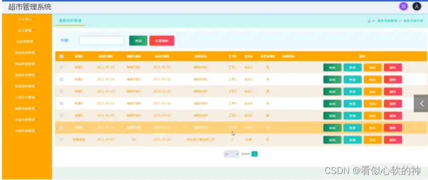 请假信息管理,在请假信息管理页面中可以查看标题、请假日期、请假天数、结束日期、请假内容、工号、姓名、是否审核、审核回复等内容,并且根据需要对已有请假信息管理进行详情,修改或删除等详细操作。