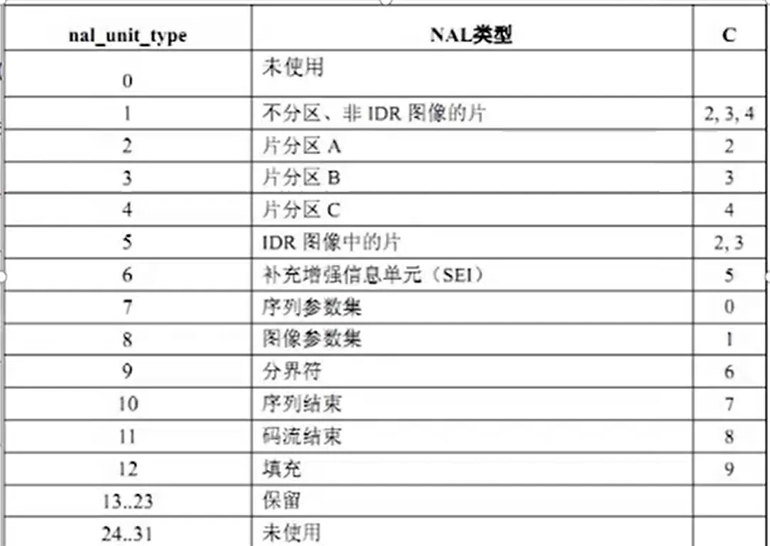 作用 | 当网络发现NAL单元有比特错误时,可设置该比特为1,以便接收方丢掉该单元 | 标志该NAL单元用于重建时的重要性,值越大,越重要,取值为00~11 | 1~23表示单个NAL包,24~31需要分包或者组合发送。 |