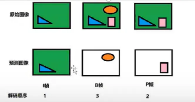 B帧:双向预测编码帧,记录了本帧与前后帧的差别,解码需要参考前面一个I帧或者P帧,同时也需要后面的P帧才能解码一张完整的图像。