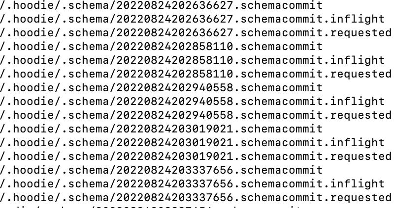 如图所示,每次提交生成一份历史的schema,位于${basePath}/.hoodie/.schema目录下。