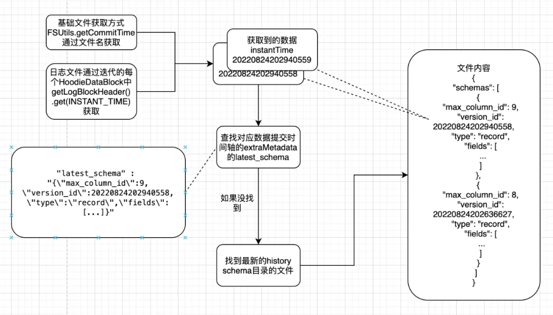 如果能够获取,直接取其中extraMetadata中的latest_schema内容作为数据schema 如果不能获取,在获取最新的${basePath}/.hoodie/.schema/下的具体文件后,通过文件内容搜索具体 InternalSchema找到最新的history 如果有InstantTime对应的versino_id,直接获取 如果没有InstantTime对应的versino_id,说明那次写入无变化,从那次写入前的最新一次获取