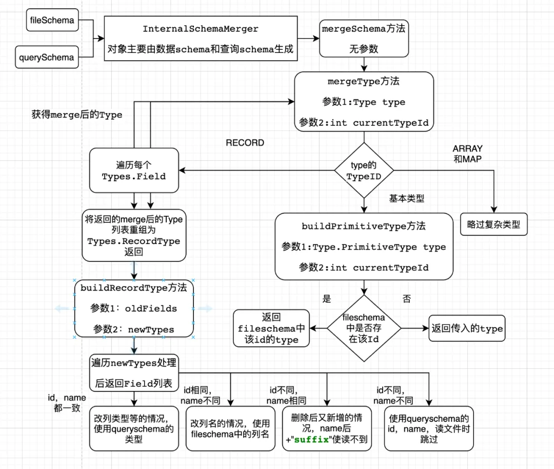 • 输入数据schema和查询schema,和几个布尔属性,获得InternalSchemaMerger对象
