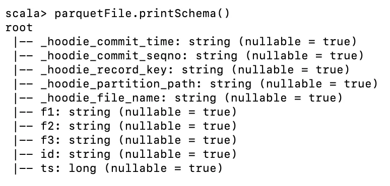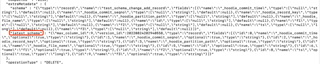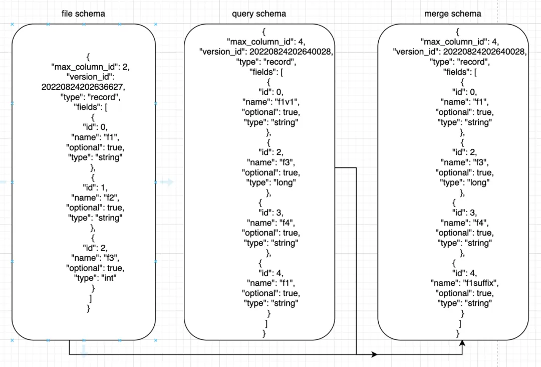 { "schemas": [ { "max_column_id": 8, "version_id": 20220824202636627, "type": "record", "fields": [ ... { "id": 5, "name": "id", "optional": true, "type": "string" }, { "id": 6, "name": "f1", "optional": true, "type": "string" }, { "id": 7, "name": "f2", "optional": true, "type": "string" }, { "id": 8, "name": "ts", "optional": true, "type": "long" } ] } ] }