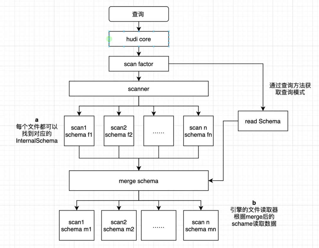 3.在scan中获取数据schema后与查询schema进行merge,通过merge的schema来读取具体数据