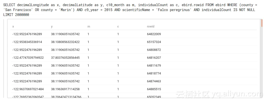 如果我们使用你已经熟悉的MapD Immerse SQL编辑器,将会获得一个可视化的列表图表,显示的是2015年特定月份的游隼踪迹的纬度和经度坐标: