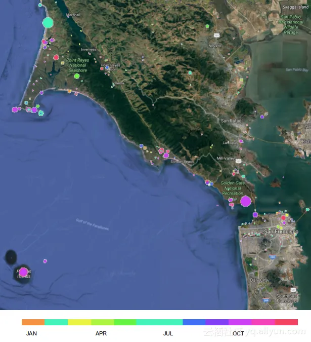 我们可以看到,最大数量的游隼出现在十月份,可以预料到,在霍克山、金门大桥北面和法拉隆群岛也都能观察到游隼。雷耶斯的西北地区在六月份出现大量的游隼,这真是意想不到的,这也表明需要更多的数据或不同的可视化来更好地了解游隼迁徙的影响。同时我们也可以看到这些景象集中在沿海地区,大概是因为海鸟是游隼最喜欢的饮食。