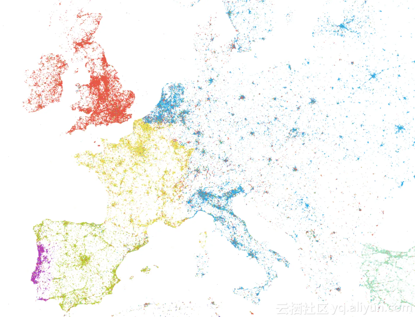 MapD Vega是基于Jeffrey Heer及其在华盛顿大学的团队开发的开源Vega规范。我们已经将原始规范适用于MapD平台,因此可以使用SQL研究数据,并能快速实施自定义可视化。MapD使用Vega直接在SQL查询的结果集上驱动渲染引擎,而不需要数据离开GPU,使得用户能够以纯粹的前端可视化工具以不可能的方式可视化细粒度数据。下图是Vega渲染的欧洲推文图像,根据语言进行颜色编码,这可以在Vega文档示例中找到: