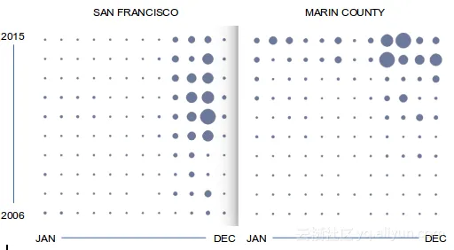 在这里我们使用月份和年份代替纬度和经度来扩展我们的数据点,使用规范county= ‘San Francisco’及county = ‘Marin’渲染两个图表,下图将其结合并对其注释: