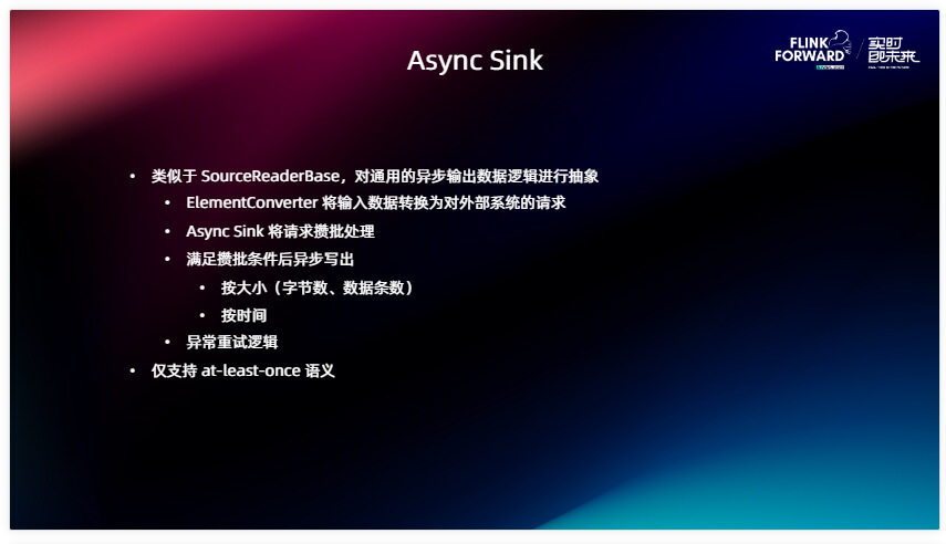 类似于刚刚介绍的 SourceReaderBase, 为了简化 Sink 的开发,我们提供 Async Sink 的基类,它提供的能力是对一些通用的、异步输出数据逻辑,通过这些场景来提供一个基本的抽象。在这里面涉及的概念比如 ElementConverter 会将我们上游的数据转换成能够对外部系统进行的真正的请求。Async Sink 本身会提供攒批的能力,用户可以通过设置攒批的条件比如当数据达到一定的大小,然后攒批的时间是多少之后,然后将这一批请求的批量提交到外部系统当中去。同样这里面也提供了内置的异常重试逻辑,如果是某次提交失败了,那么在下一次提交的时候再一次尝试把这些数据进行重试提交。基于这些逻辑我们可以看到实际上它只是实现了一个 at-least-once 语义的。但实际上我们生产当中,绝大部分的 Sink 都是 at-least-once ,因为实现一个 Exactly-once 的成本会很大,有一些 Sink 会觉得费了半天劲实现一个 Exactly-once 的 Sink 但是真正应用的人很少,那不如退而求其次,能够把 at-least-once 语义做到极致就可以了。如果你的 Sink 只需要实现 at-least-once 语义,不妨尝试 Async Sink ,能够大大降低大家的开发难度。